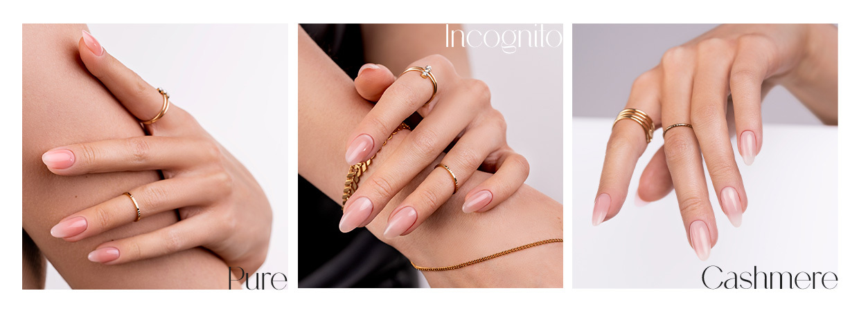 Den er tilgjengelig i 7 nydelige og fasjonable nyanser - fra melkeaktig til gjennomsiktig. Cashmere, Diva, Incognito, Innocent, Nailicious, Pure og Obsession.