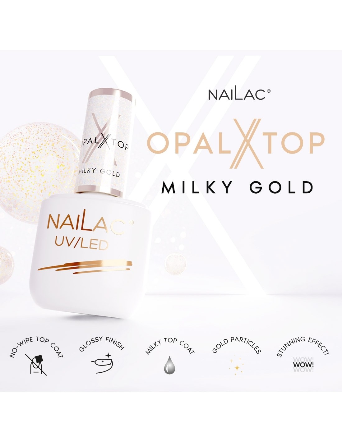 NaiLac OpalX Blush Gold Top – en versjon som ikke trenger å tørkes av og som ikke krever skylling. Gullshimmeret er subtilt, og effekten er mer sateng – vakkert for elegante antrekk og høytidsmiddager.