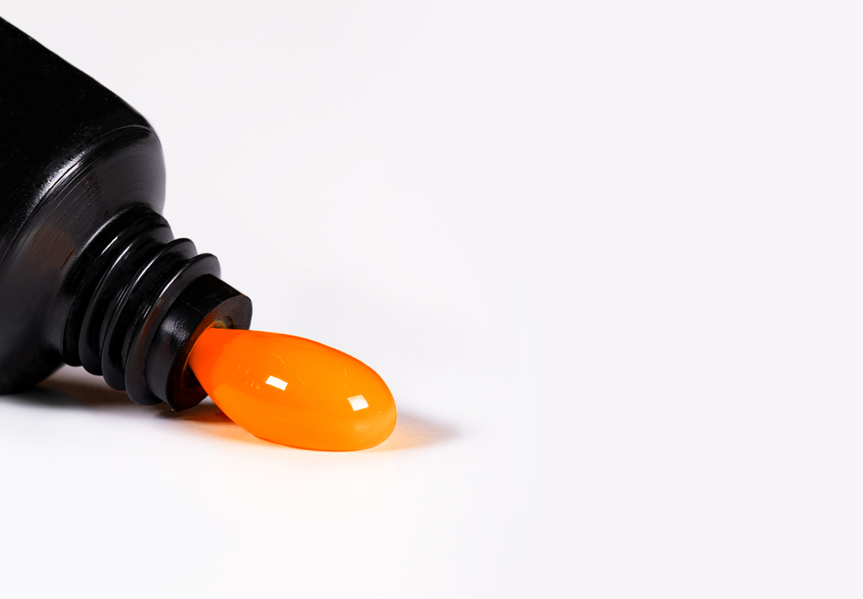 - Oransje neon UV-gel, ideell for ornamenter, maling av mønstre eller skyggelegging. 100 % dekkende