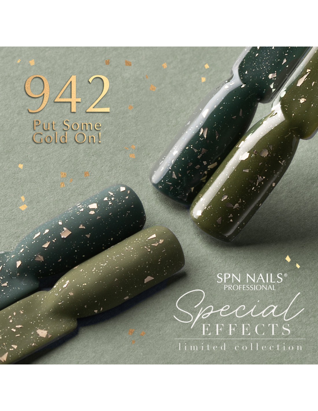 942 Put Some Gold On! - det er en matt, gjennomsiktig lakk, raffinert med gullfargede partikler. Den passer perfekt med rødt eller burgunder, men også med mørke, uttrykksfulle lakker.