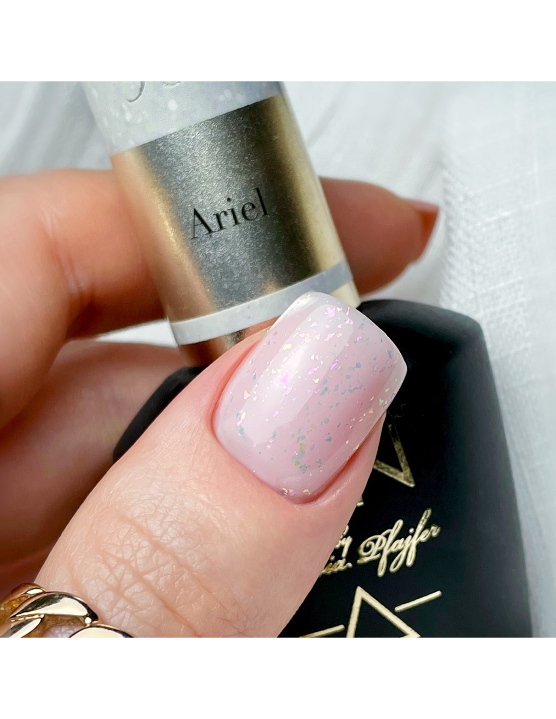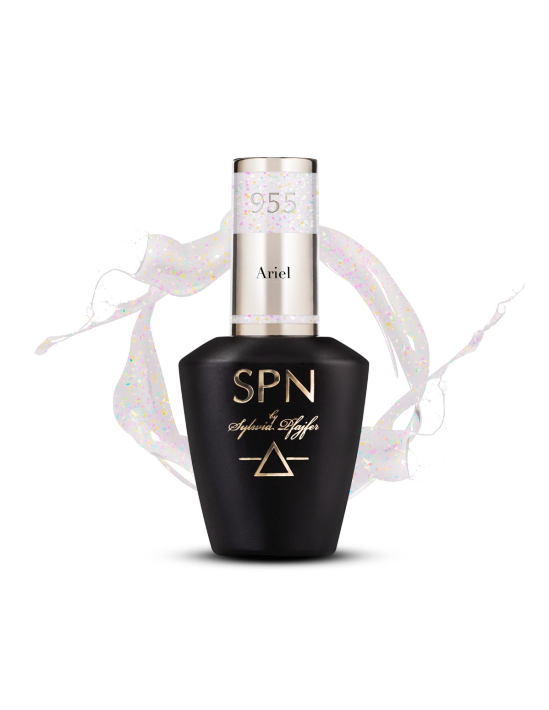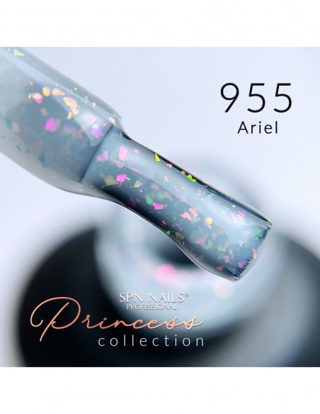 955 Ariel er en melkeaktig gelpolering med tusenvis av skimrende partikler, hvor rosa, oransje og grønt skiller seg ut.