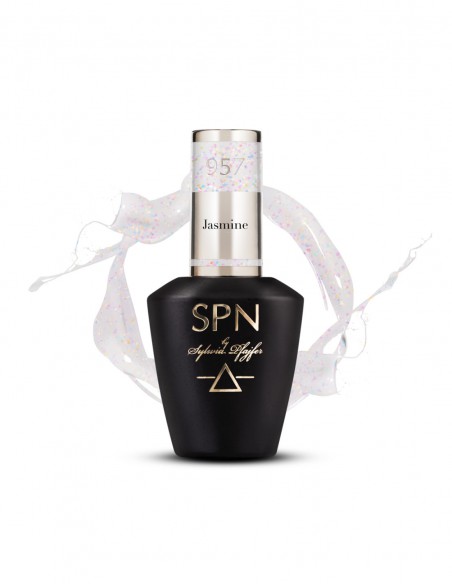 957 Jasmine er en melkeaktig lakk med tusenvis av glitrende partikler, der rosa, oransje og lilla dominerer.