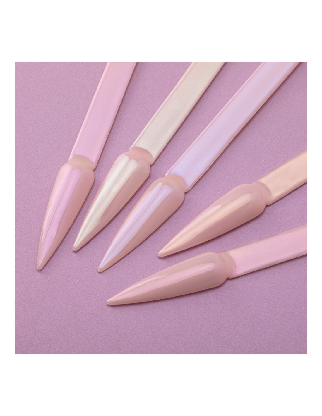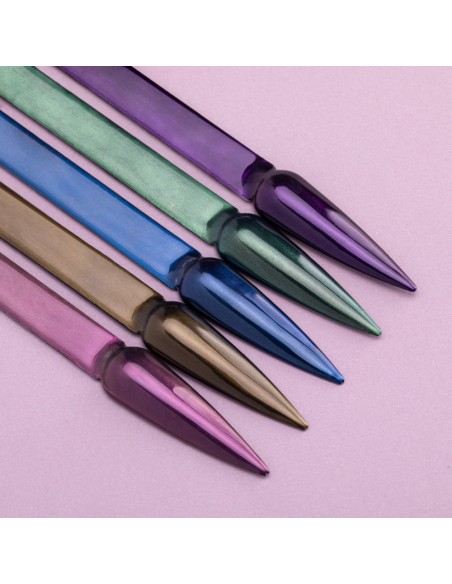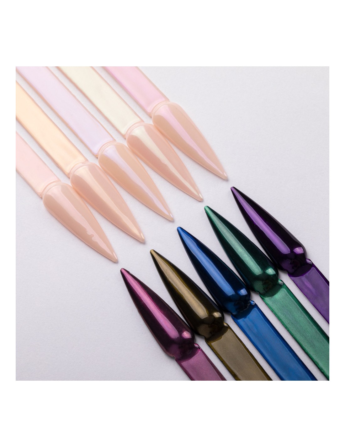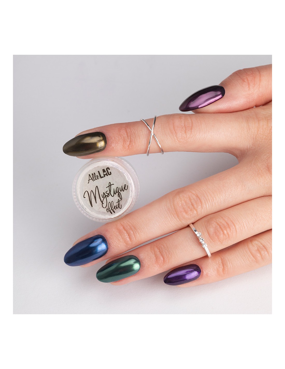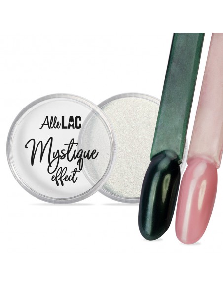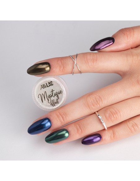 Mystique er et støv som skaper en delikat sateng, lett overflate på neglene. Avhengig av grunnfargen eller dine personlige preferanser, kan du velge mellom fem nyanser - rosa, lilla, gull, pastellmalakitt og babyblått.