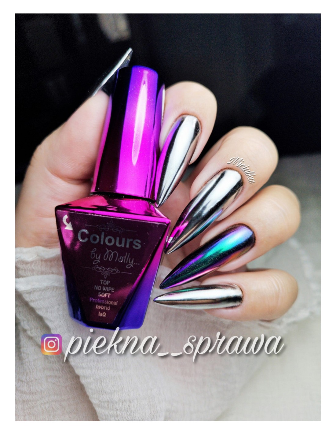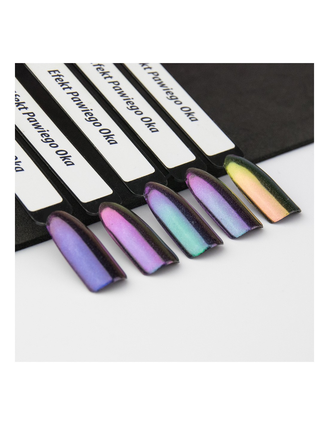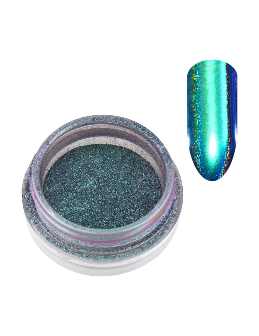 Prismatisk, flerfarget holografisk pudder for neglestyling, som gir en perfekt overflate. Fargen avhenger av lysets vinkel. Den mest spektakulære effekten som ligner påfuglens øyeeffekt, kan oppnås i sterkt, kunstig lys.
