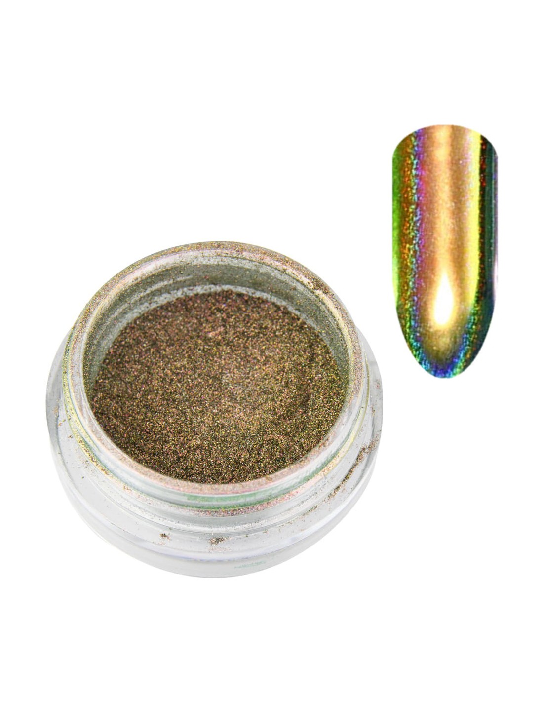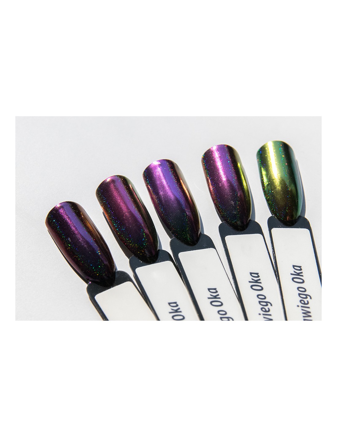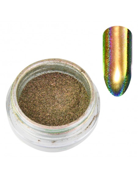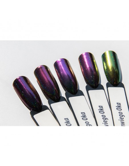 Prismatisk, flerfarget holografisk pudder for neglestyling, som gir en perfekt overflate. Fargen avhenger av lysets vinkel. Den mest spektakulære effekten som ligner påfuglens øyeeffekt, kan oppnås i sterkt, kunstig lys.