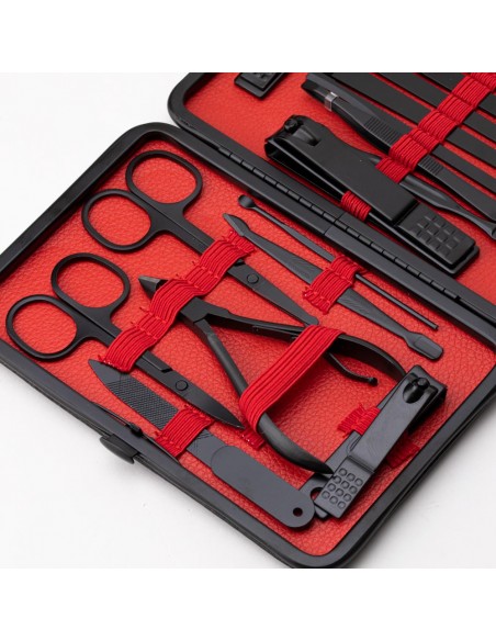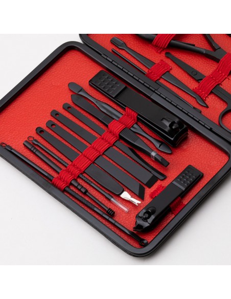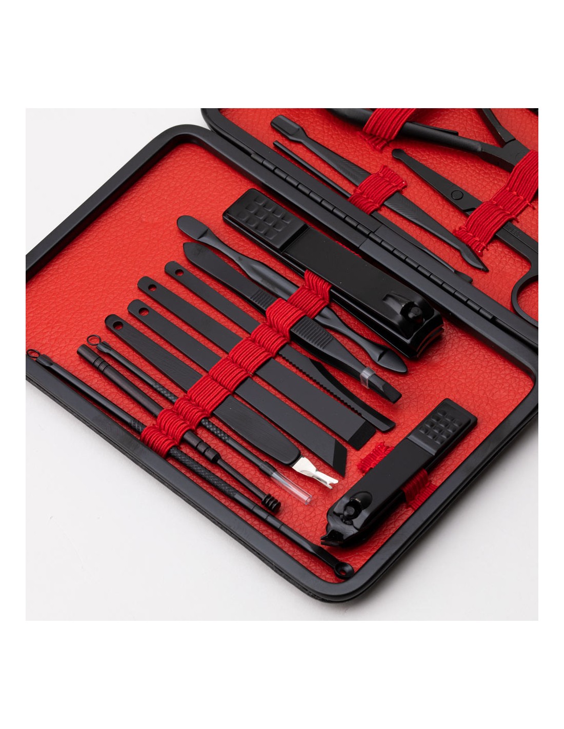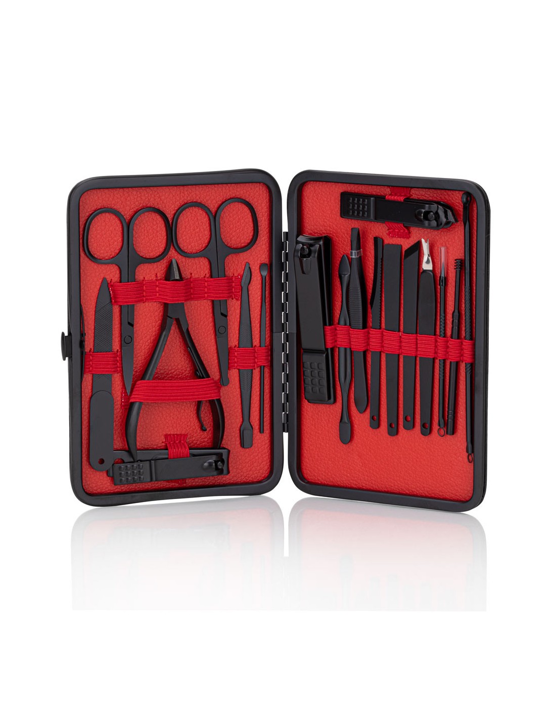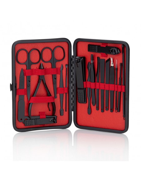 Sett med 18 kosmetiske tilbehør for manikyr, pedikyr og ansiktsbehandlinger i et svart og rødt etui
