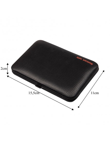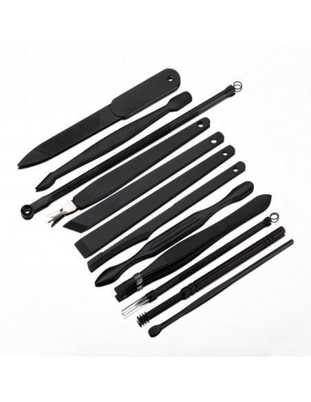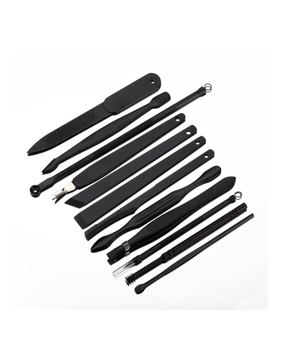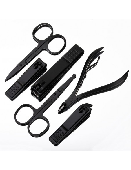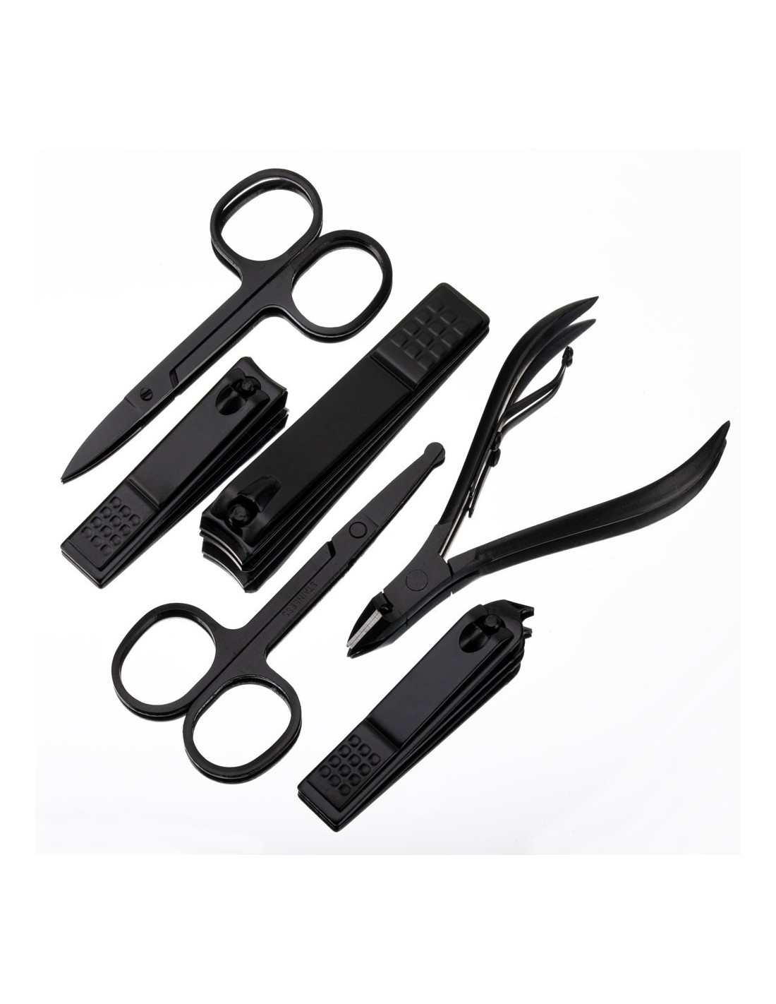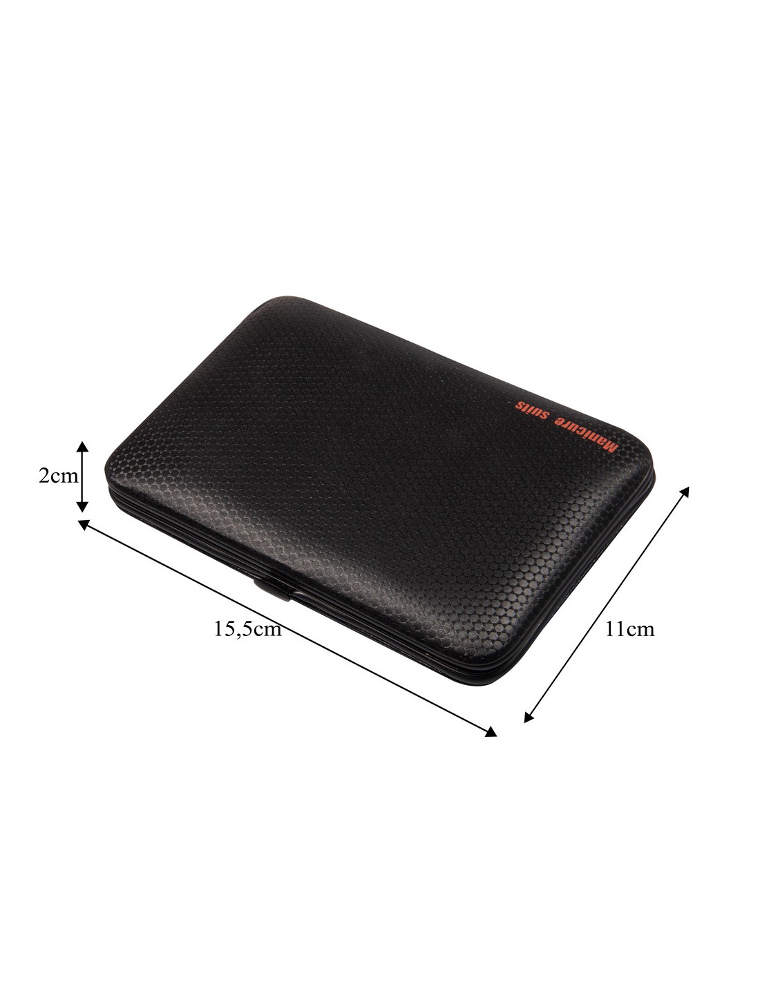 Et sett med 18 ekstremt elegante, svarte, matte kosmetiske tilbehør som fullt ut vil ta vare på hendene, føttene og ansiktet. Med dette settet vil du forkorte neglene, forme dem, fjerne tørre neglebånd og forberede neglene for videre pleiebehandlinger. Verktøyene laget av rustfritt stål er ekstremt slitesterke, motstandsdyktige mot slitasje og anløpning, samt mot mekanisk skade. I tillegg er materialet hypoallergent, så selv personer med svært sensitiv hud kan bruke det.