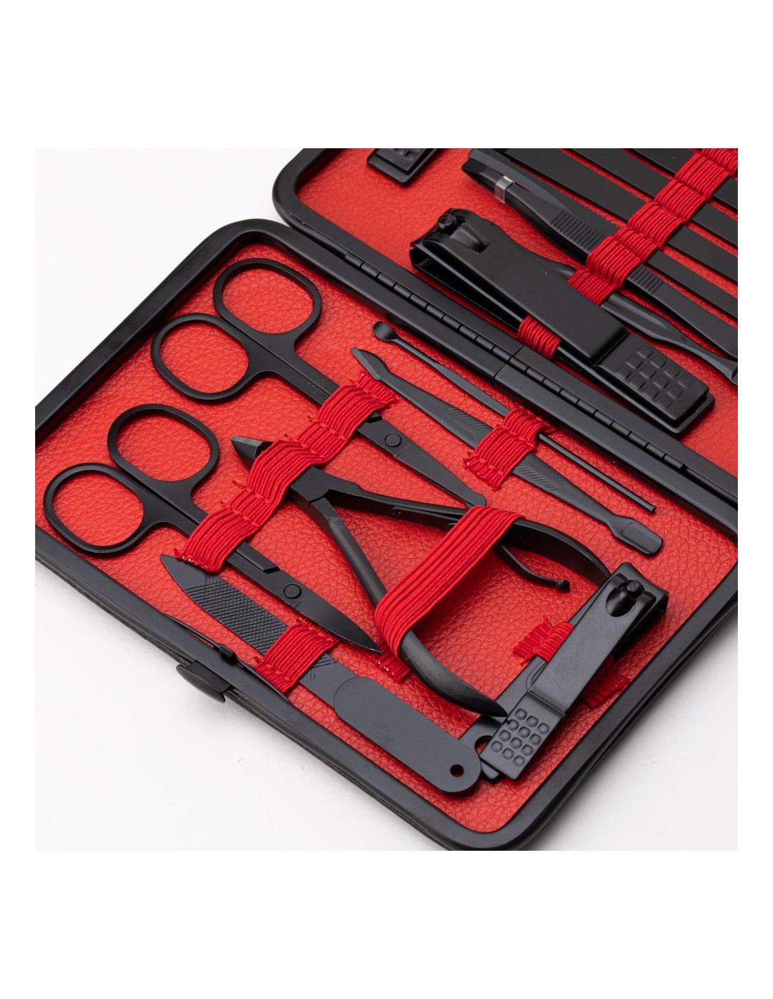 Sett med 18 kosmetiske tilbehør for manikyr, pedikyr og ansiktsbehandlinger i et svart og rødt etui - CC046