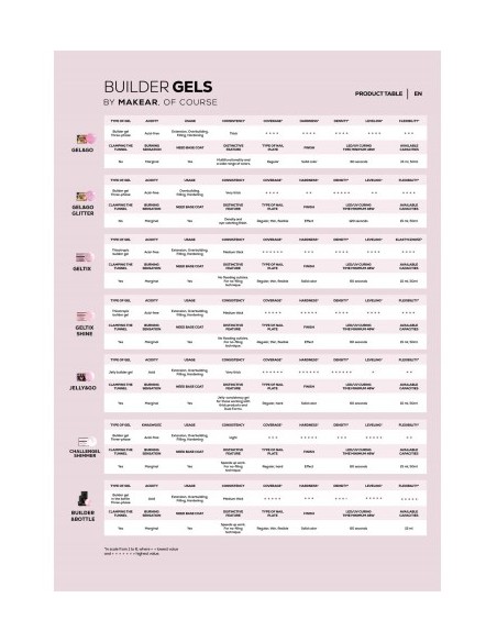 Er en gel designet for rask salongarbeid. Ideell til å jobbe med teknikken uten å file, utvide neglene med negleform, gjøre restaureringen og styrke de naturlige neglene. Det er hardt og derfor holdbart og motstandsdyktig mot skade eller eksterne faktorer. Den middels tykke konsistensen og selvnivelleringen gjør det enkelt å spre produktet uten å søle over neglebåndene, noe som øker arbeidstempoet.