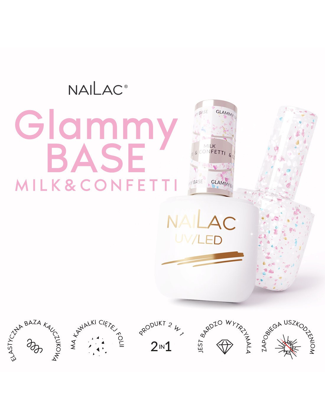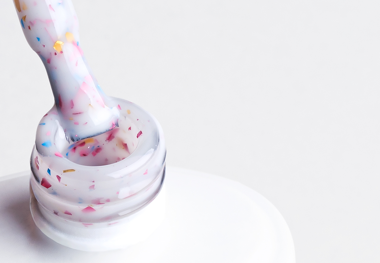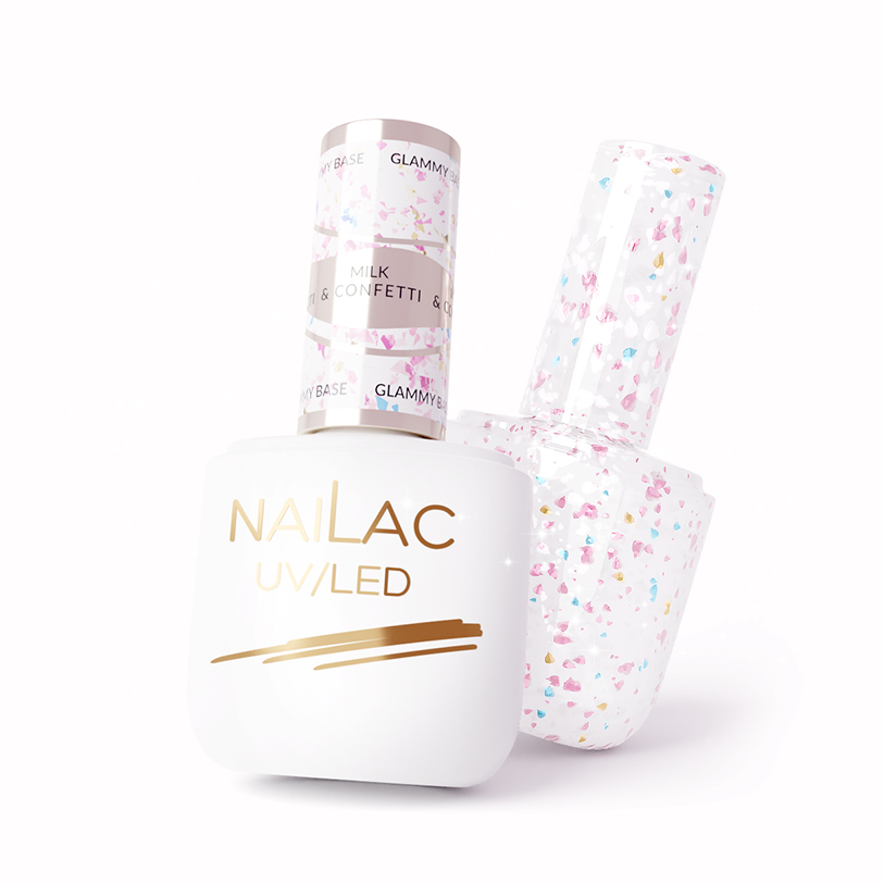 Det er på tide å feire i en virkelig elegant stil! Glammy Base Milk &Confetti er en melkeaktig gummibase der vi har innebygd biter av kuttfolie i tre nyanser - gull, rosa og blå. Det er en ekte kinaputt som vil live opp ethvert festantrekk og understreke din unike stil! Bare ett lag av det vil sette deg i stemningen av gledelig feiring og virkelig festglød, uansett anledning.