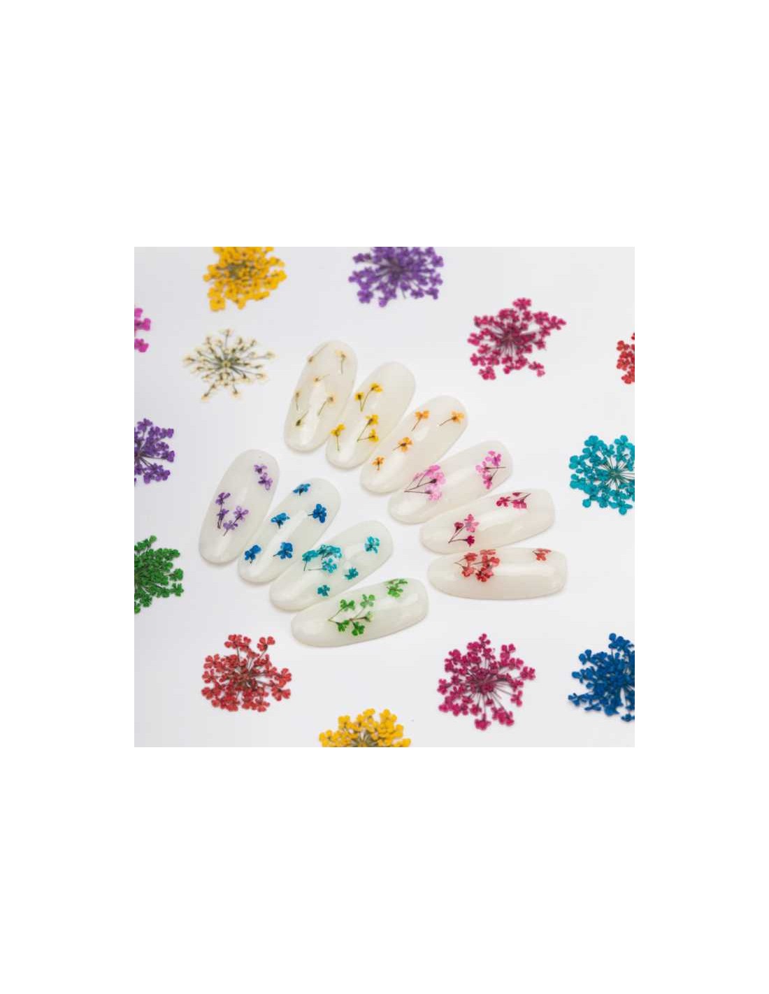 *Dekorasjoner med tørkede blomster kan brukes på ulike måter - enkeltblomster på hver negl, en subtil bukett på en negl eller delikate blader og kvister som danner hele mønsteret på hver negl.