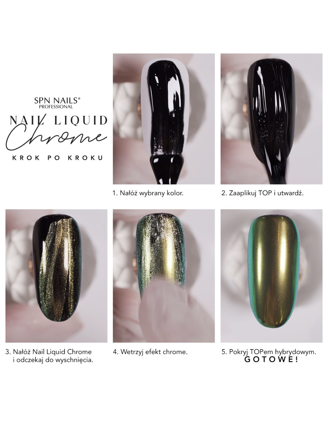 Oppdag en ny måte å påføre pollen på - Nail Liquid Chrome er et flytende produkt, innelukket i en praktisk flaske med en børste, som muliggjør rent og behagelig arbeid med pollen!