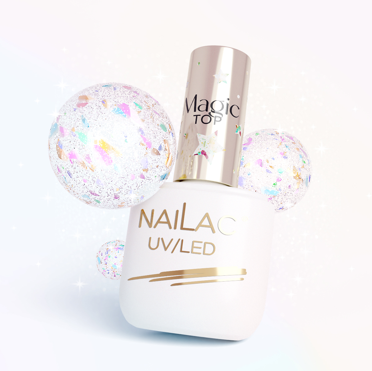 Abrakadabra, hokus-pokus... Det er tid for den magiske toppen! En hybridtopp med partikler – som ved et trylleslag – vil få alle fargene på neglene dine (fra svart til pasteller!) til å skinne med en flerfarget glød av glitter og konfetti. Slå på blitsen og se selv at dette ikke er en illusjon – i rampelyset kaster NaiLac-toppen en enda mer spektakulær sjarm.