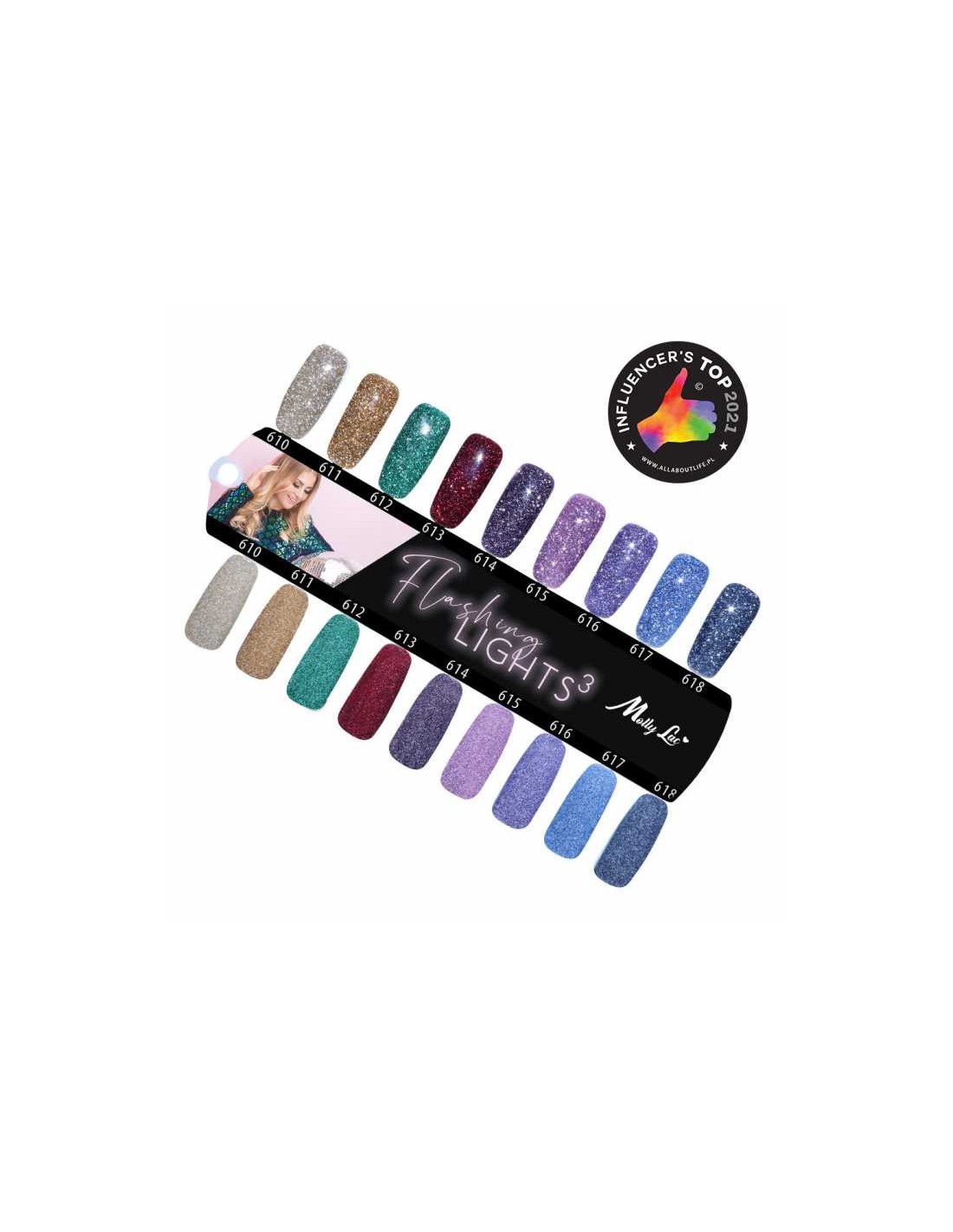 MOLLYLAC FLASHING LIGHT fargepalett test. Det er med lyset at alt begynner ... Og det ender med lyset! Kolleksjonen av sublime farger fra MollyLac skjuler to ansikter.