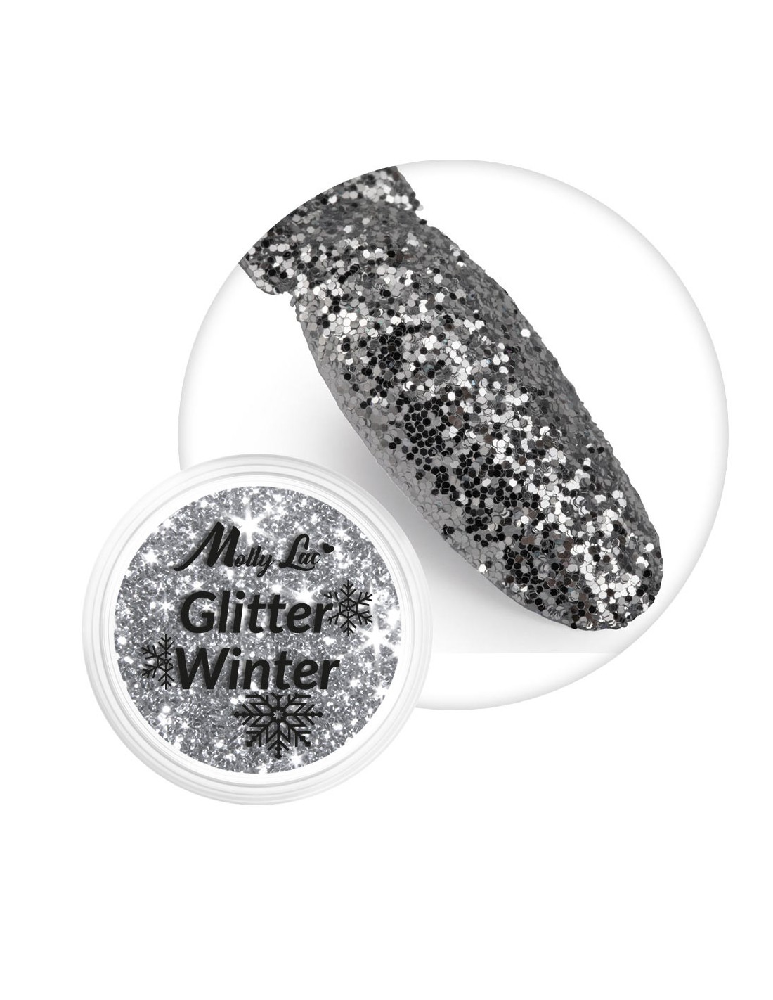 Den karakteristiske sølvfargen på glitteret minner om skinnende snø eller kaldt vinterlandskap. Den sterke sølvtonen gir neglene eleganse og gir dem en effekt forbundet med juleglans.
