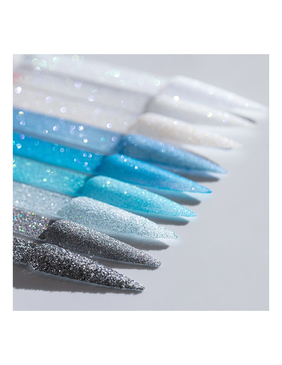 Hvitt pulver med partikler i en nyanse av gull og delikat grønn reflekterer perfekt vinterens atmosfære, og gir eleganse og delikat, festlig sjarm til manikyret.Å lage en manikyr med dette pulveret er den perfekte måten å gi neglene dine en snødekt eleganse og subtile fargevalg mens du skaper et glamorøst og vinterlig utseende.