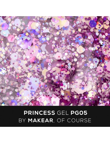 Princess Gel er en nail art gel med flerfargede glitterpartikler som kan påføres hele negleplaten, og skaper prinsessenegler, strukturelle french, omvendt ombre eller delikate dekorasjoner og aksenter.