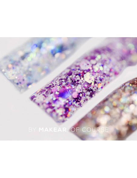 Dekorativ gel med flerfargede biter av forskjellige størrelser og former, som skaper en glitrende effekt.