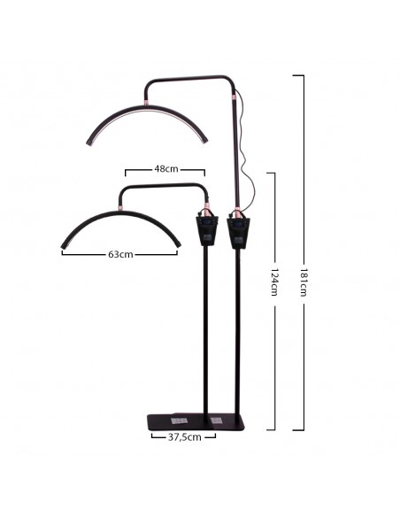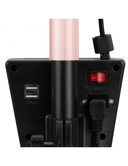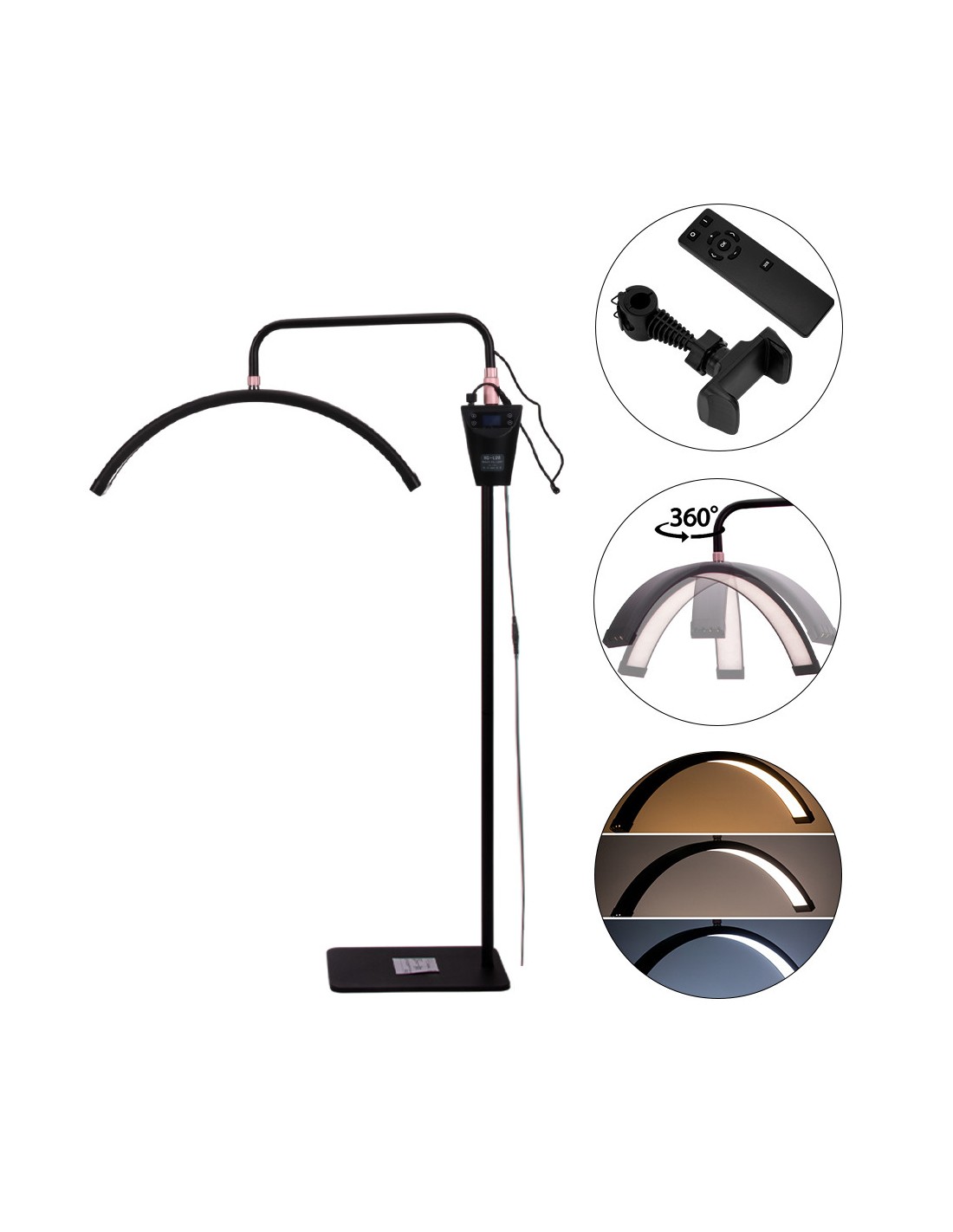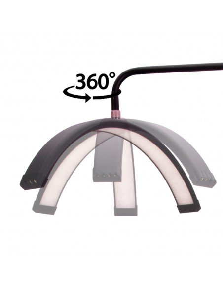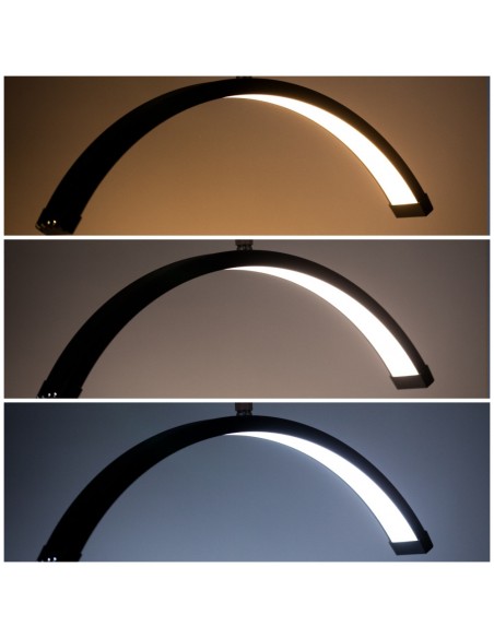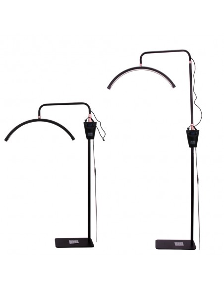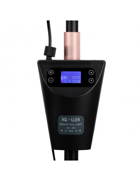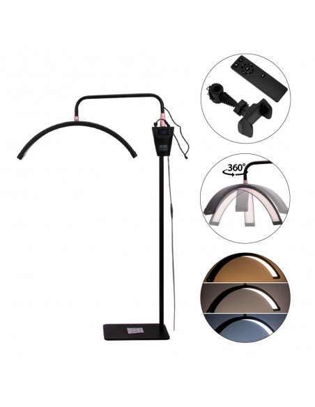 Lampen kan tilpasses mange posisjoner takket være den justerbare høyden på stativet (124-181 cm), som garanterer maksimal arbeidskomfort. Det bevegelige lampehodet gir mulighet for 360-graders rotasjon, slik at du raskt og enkelt kan justere belysningsposisjonen. Lampen kommer også med en telefonholder som du kan feste over lampehodet. Lampen er i tillegg utstyrt med en praktisk og tydelig skjerm for å justere kraften og fargen på lyset. Skjermen er montert på stativ og høyden kan justeres. I tillegg har lampen en USB-inngang som du kan koble telefonen til.