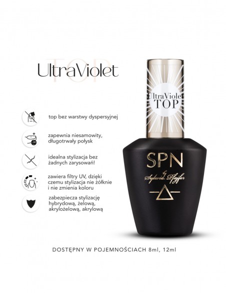 UltraViolet er en "no rinse" hybrid topp dedikert til å polere og fikse hybrid neglelakk. Den kan også med hell brukes som prikken over i-en for akryl-, akryl- eller gelstyling. Den gir en fantastisk, langvarig glans og er motstandsdyktig mot riper og mekanisk skade.