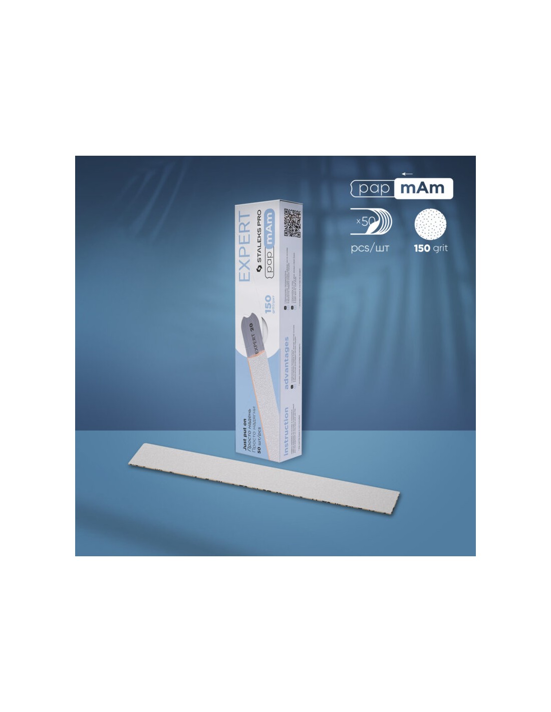 PapmAm – engangsslipemidler i form av limfrie utskiftbare filer som legger på grunnfilen som deksel. Rett form. Tynne filer. Passer ideelt til basen i størrelse, og på grunn av dette er de tett festet på den. Trygge myke kanter på papmAm-filen er laget av miljøvennlig håndverkspapir – eliminer muligheten for å kutte klienten med en fil under bruk. Enkel feste og fjerning av filen fra basen. Rengjør verktøyet uten limbiffer etter bruk. Hvit høykvalitets slipemiddel EXPERT White er estetisk i arbeidet. Et spesielt belegg forhindrer at slipemidlet tetter seg med organisk støv under bruk.