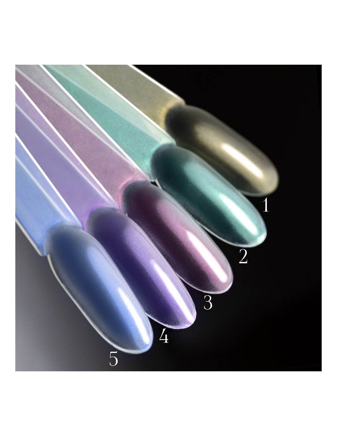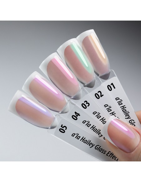A la Hailey glasseffekt er et pulver som vil gjøre stylingen din til en sateng, lysende overflate. Du kan justere den endelige effekten til dine preferanser ved å velge ikke bare fargen på selve støvet (og det er 5 av dem!), men også grunnfargen på hele stylingen.