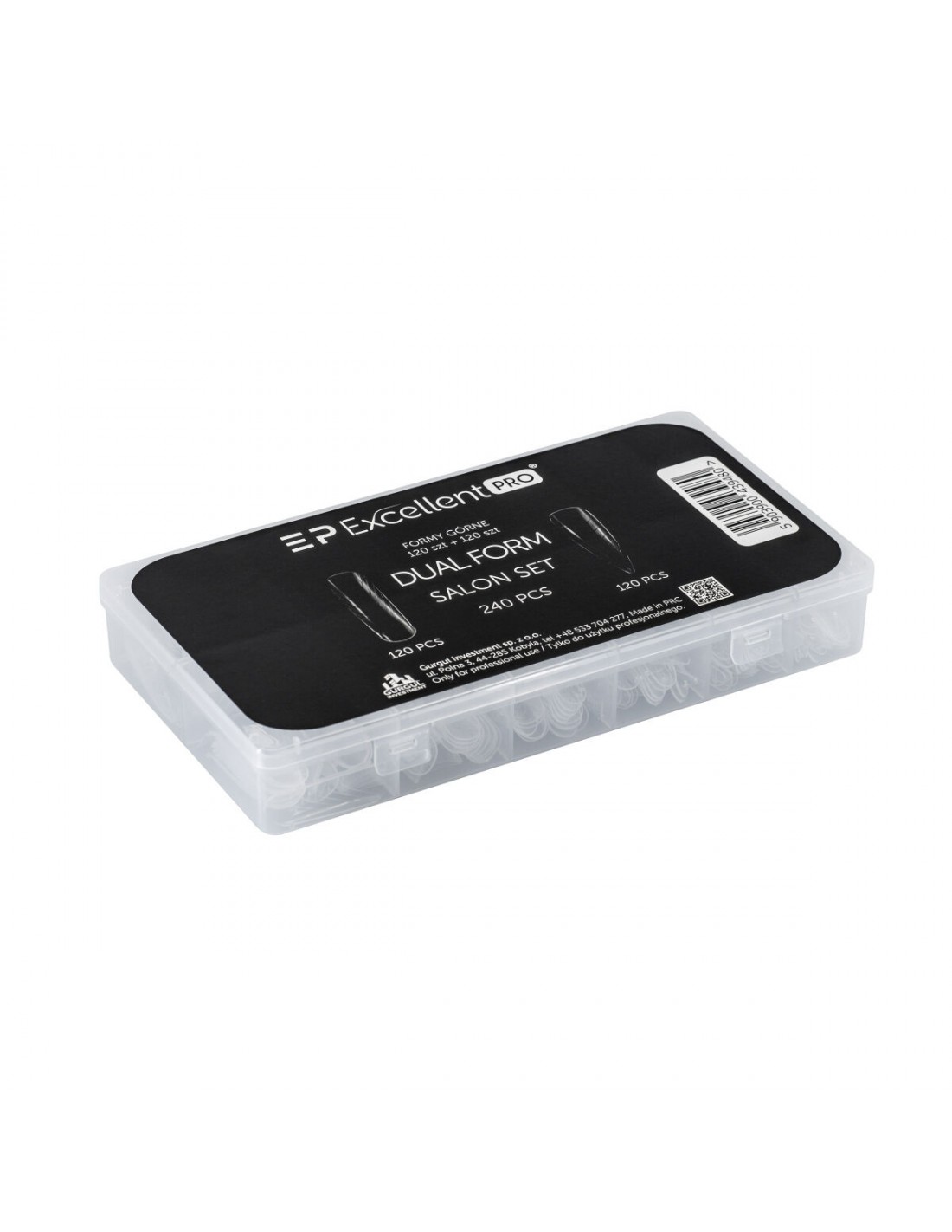 – et sett med øvre former i to former, hver med 120 deler i en romslig eske med rom. DUAL FORM SALON SETTET vil være perfekt for både erfarne stylister som ønsker å utvide sine ferdigheter og utvalg av tjenester, samt nybegynnere som ønsker å lære å lage negler med denne innovative metoden. Laget av passende fleksibel og høykvalitets plast, som muliggjør flere bruksområder for formene. Designet og spesialprofilert for å feste seg perfekt til neglen. Former som muliggjør rask og enkel negleforming. Nummeret er spesielt plassert på lommen for å være mer synlig ved første øyekast.