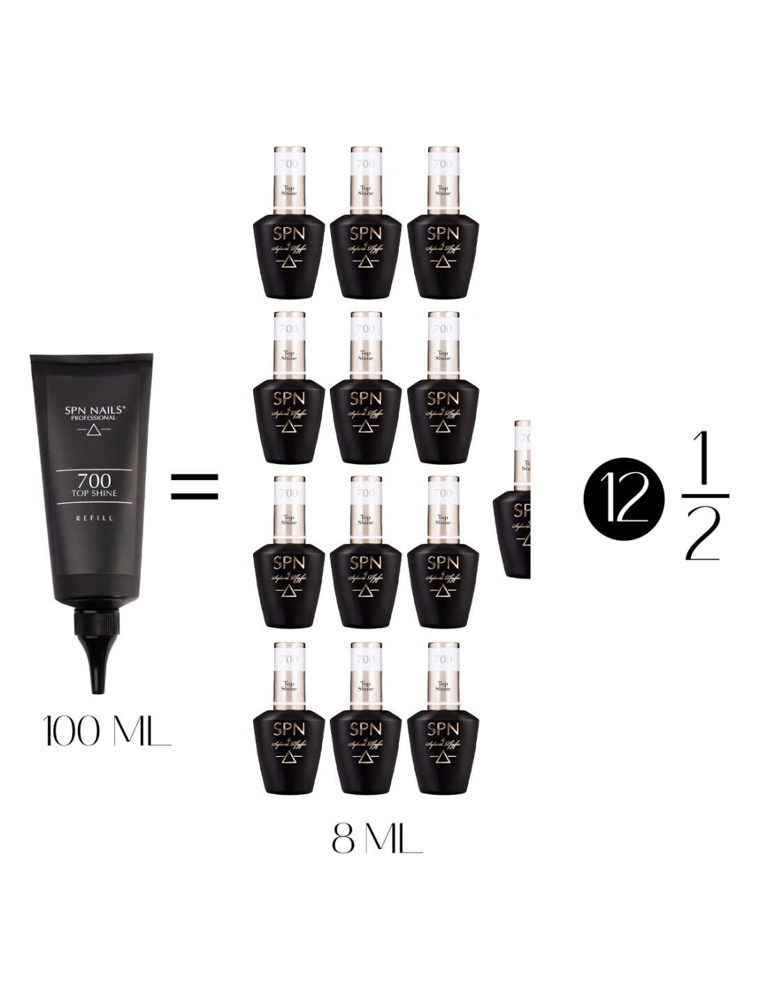 Permanent hybrid topp "uten vask" som er forberedt og dedikert for å glanse og fiksering av lakk,LaQ hybrid UV-lakk kan også brukes som finish for akryl eller gel stylisering. Takket være det mikroniserte glasset gir safiraktig top forsikrer lang levetid på opptil 6 uker, fantastisk glans som kan sammenlignes med glasset. Top SPN Nails samarbider perfekt med hybriden som skaper et fleksibelt og i godt samspill belegg med neglen, effektivt beskytter mot riper, smuss og mekanisk skade. 700 Top Shine UV LaQ har ikke et dispersjonslag og er ekstremt forsiktig mot den naturlige flisen, og det kan derfor vellykket brukes av personer med sensitiv og jevn atopisk hud. Anbefales for kvinner som liker effekten av "våte negler".