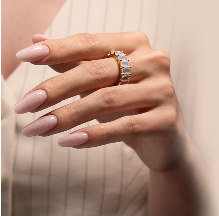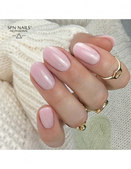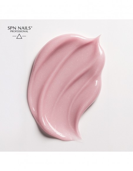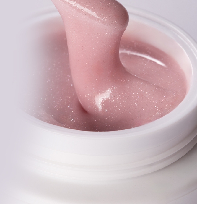 TiXo Gel Cover Dust av Marta Dziurkowska er en heldekkende buildergel i en ferskenaktig, nøytral farge med skimrende partikler. Gelen gir utmerket, puddinglignende dekning som naturlig blander ut ettervekstlinjen.