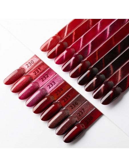 Fordyp deg i eleganse og en mystisk glød! Vår kolleksjon av magnetiske Cat Eye Red gel-neglelakker har 9 unike nyanser av rødt – fra mørk vin, via rubinrød til intens burgunder.