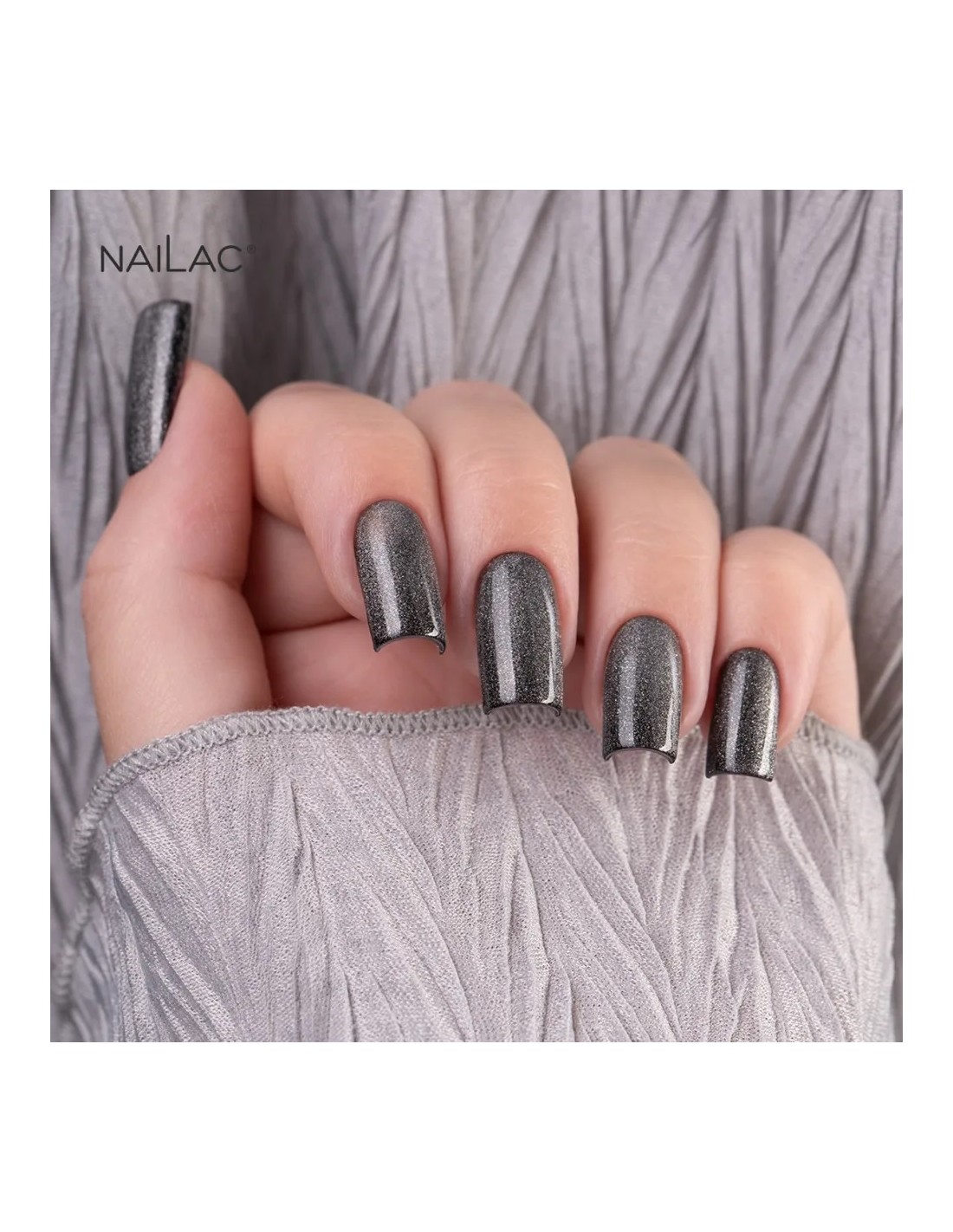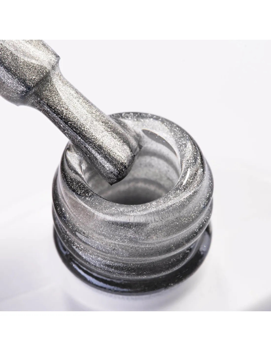 En sølvfarget nyanse full av skimrende partikler som skaper et slående glimt. Denne fargen fengsler med sin intense glans og flerdimensjonale effekt – perfekt for elskere av spektakulære negledesign med porselensfinish.