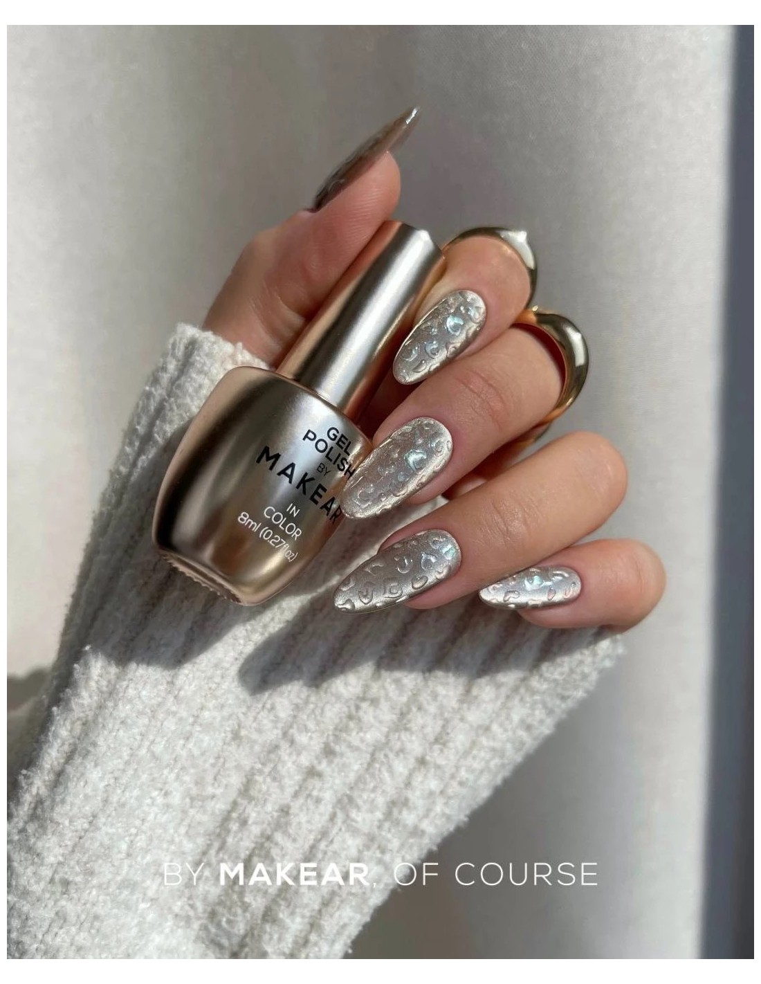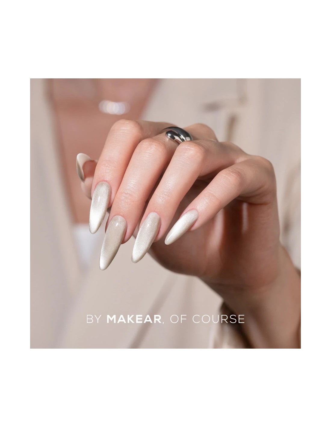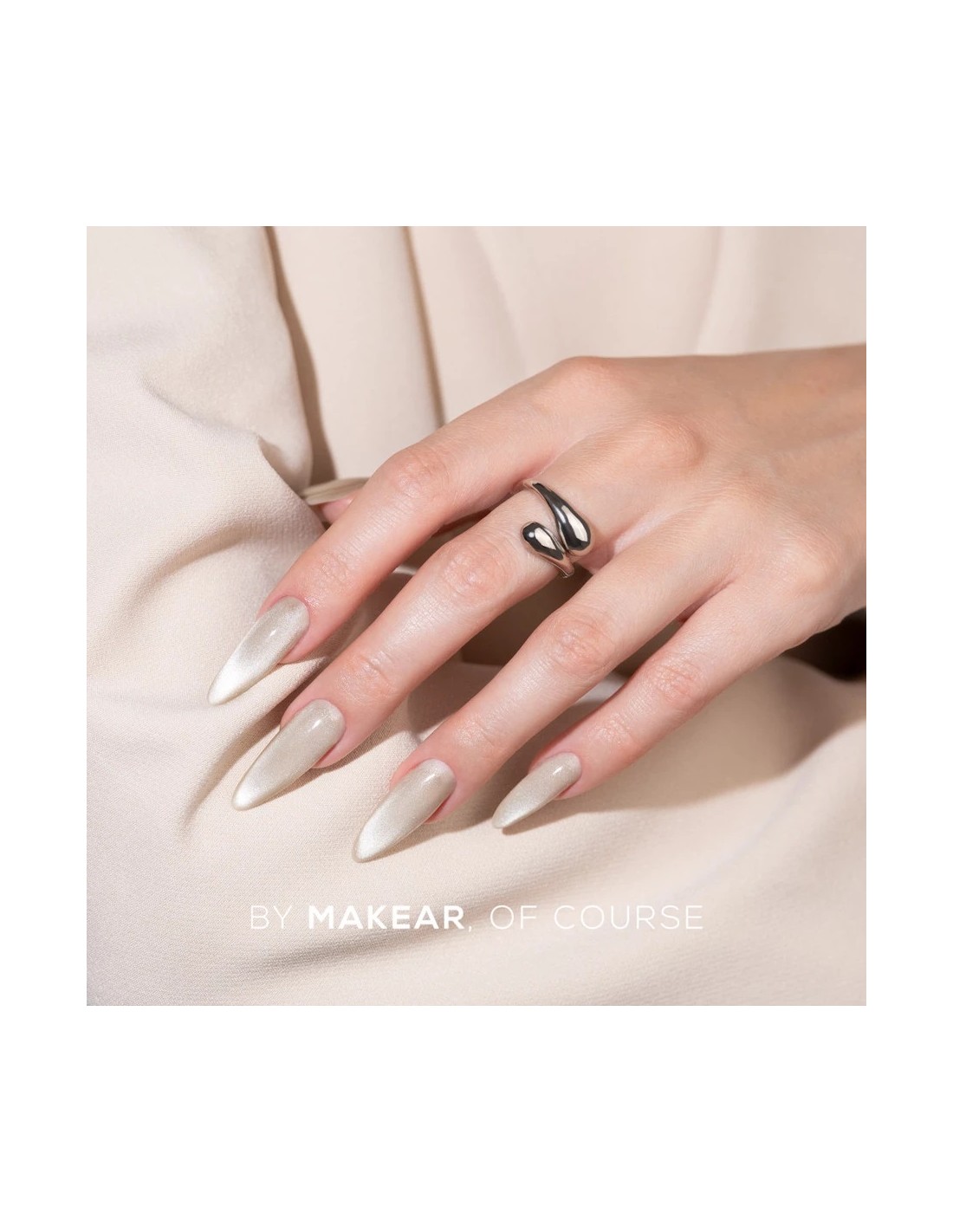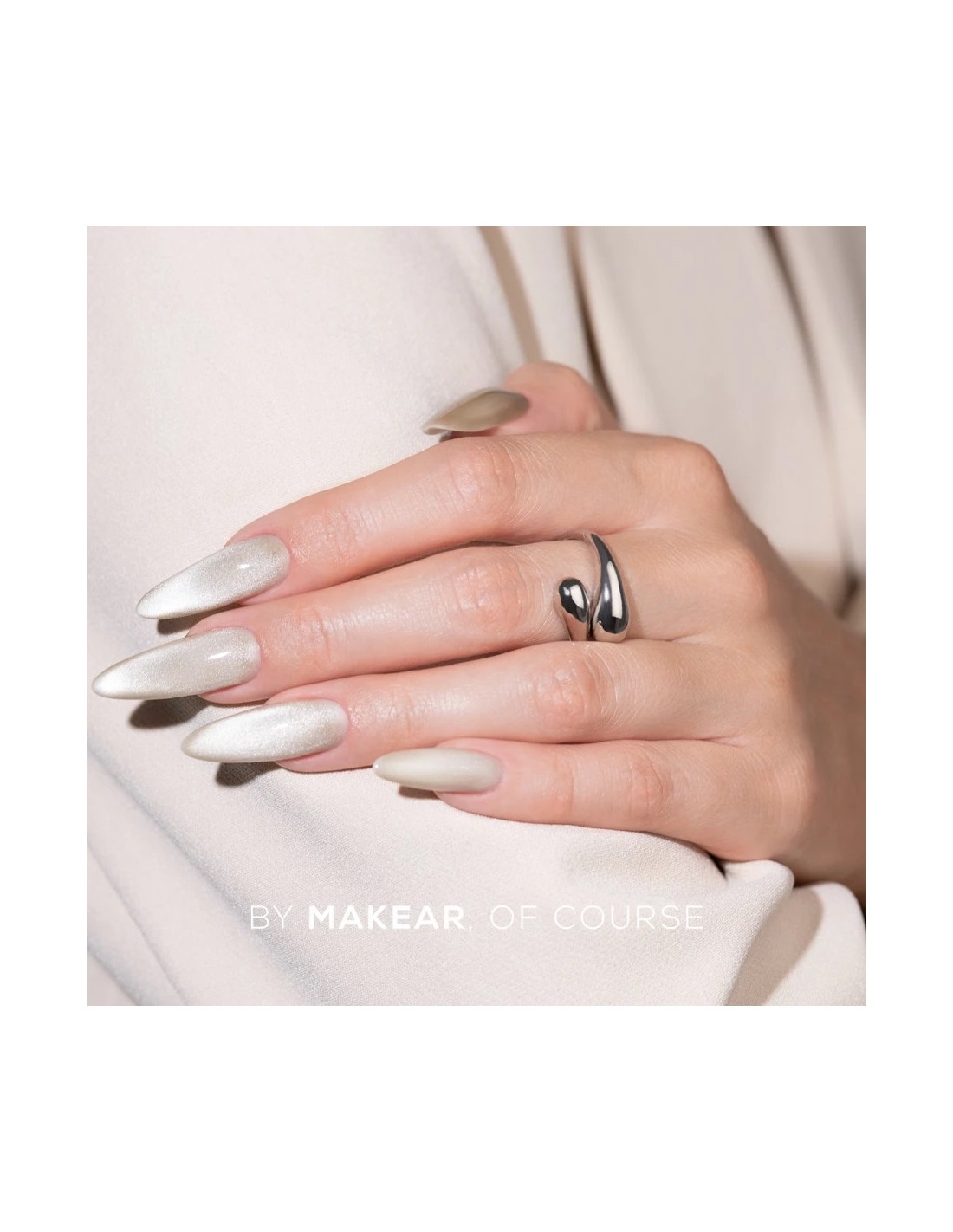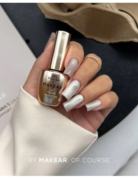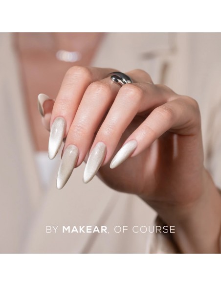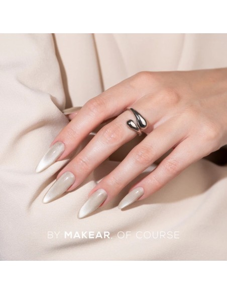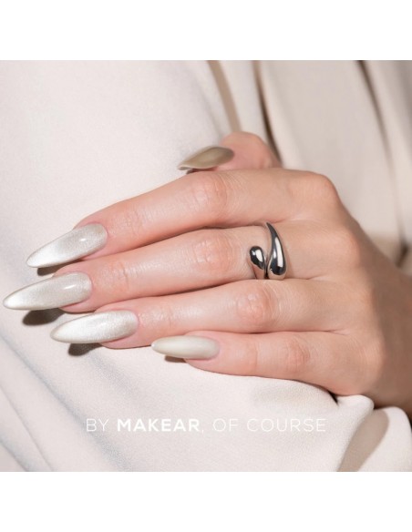 Silver Cat Eye gel polish fra Makear er en fantastisk manikyrfarge med en magnetisk «cat eye»-effekt. Takket være magnetiske partikler kan du oppnå en lysende, tredimensjonal glød som gir dybde og unikhet til ethvert negledesign.