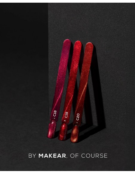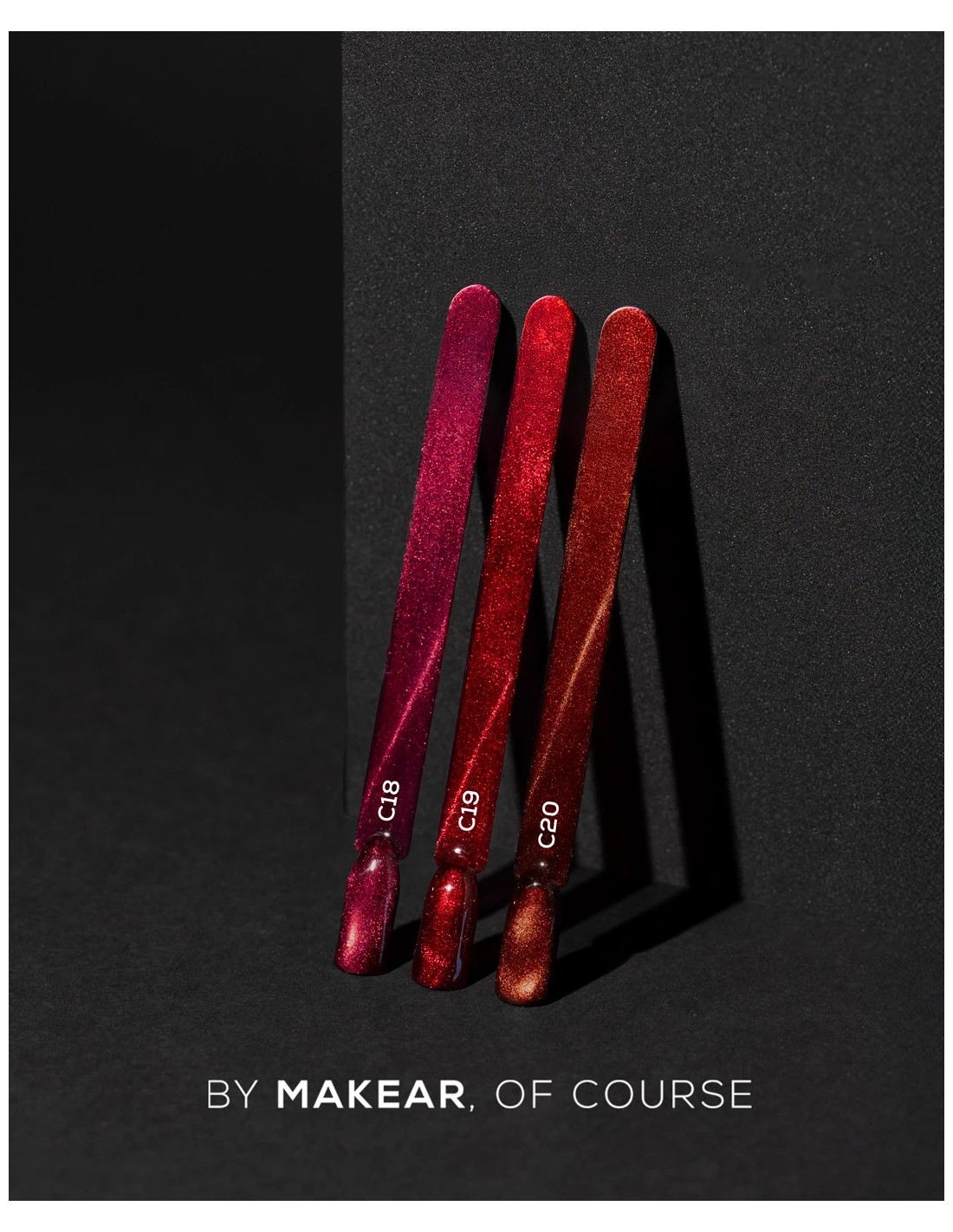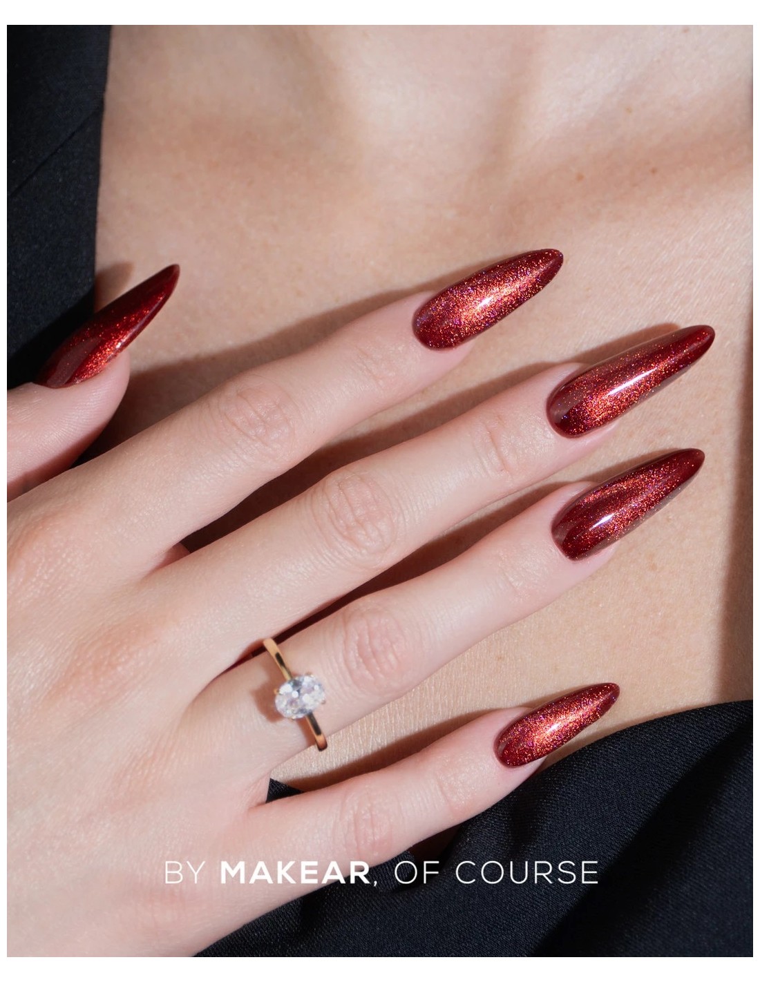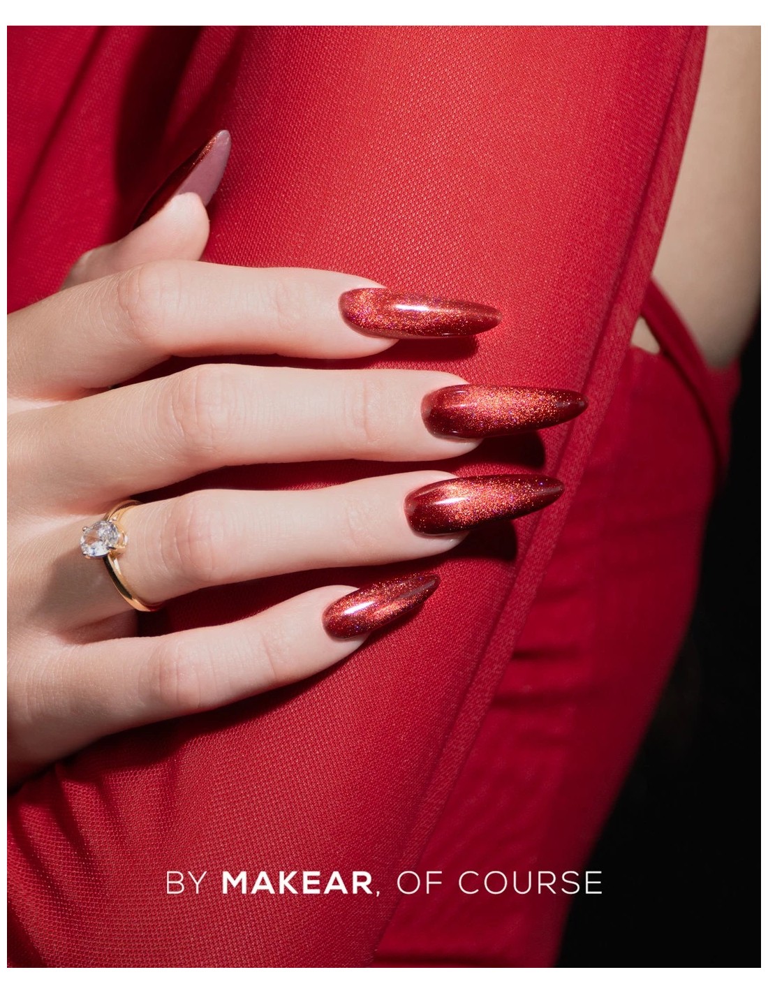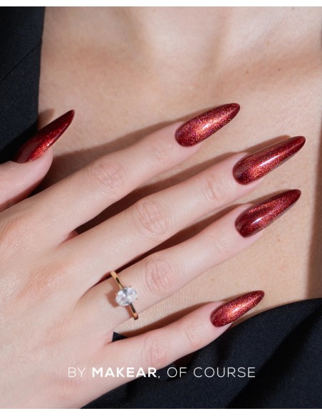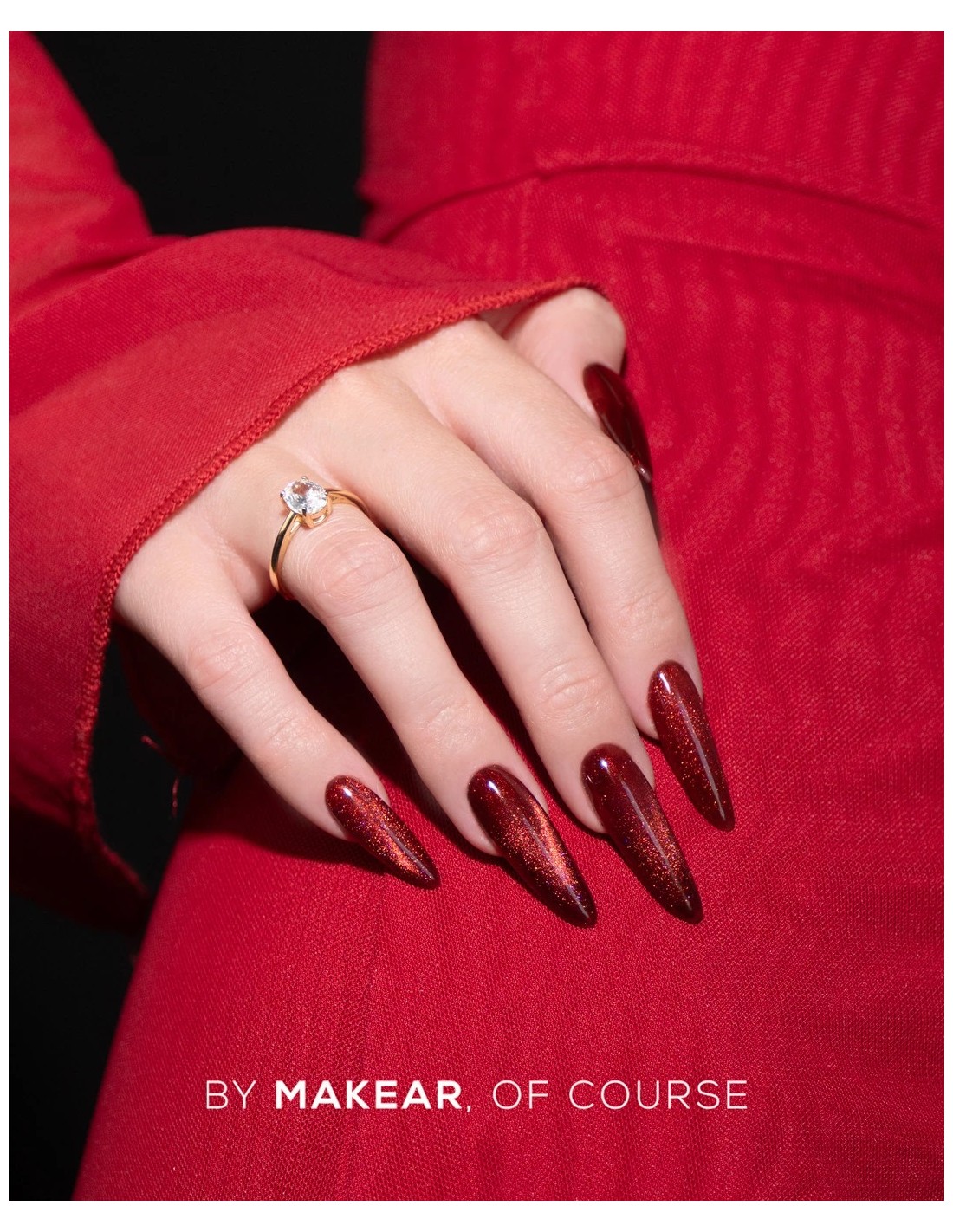 Rød Cat Eye hybridlakk tiltrekker seg oppmerksomhet med sin dype farge og subtile lysspill. Magnetiske partikler skaper cat-eye-effekt som endrer seg med synsvinkelen. Det er en farge som fungerer for hverdagsantrekk så vel som mer uttrykksfulle stiler.