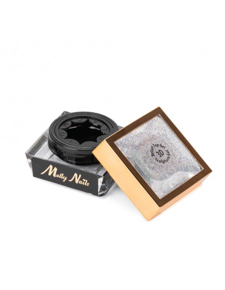 Kan gnides inn speilpudder etter 60 sekunders herding i lampen. (Ikke glem å påføre toppstrøk på nytt etter at du har påført støvet!)