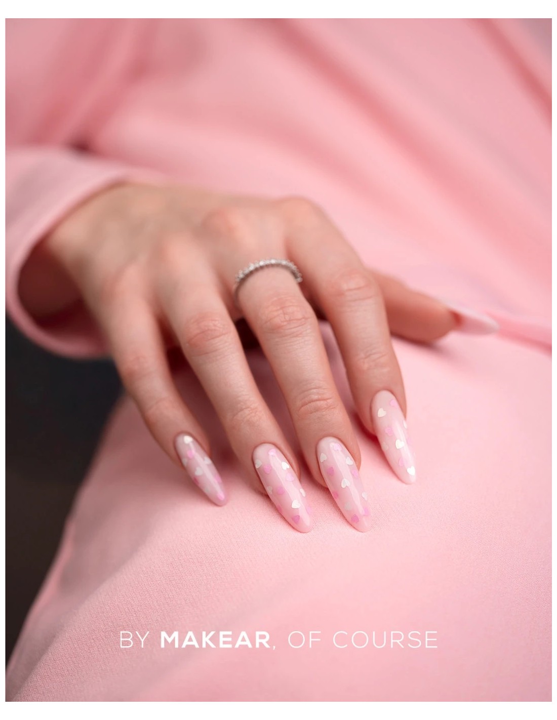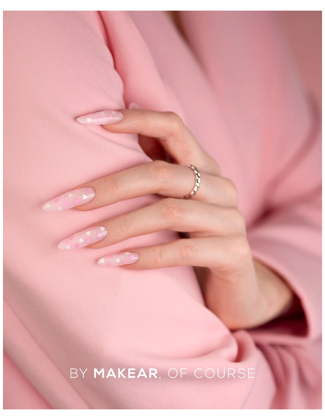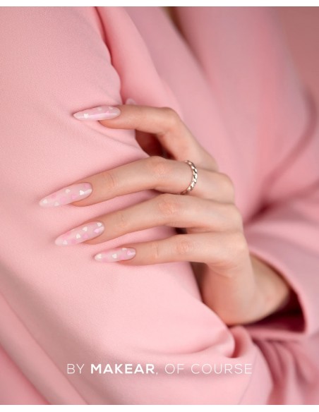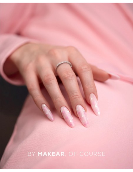 Top No Wipe Hearts fra MAKEAR er en hybrid topplakk som kombinerer en langvarig blank finish med en subtil dekorativ effekt. Innebygde hvite og rosa hjerter gir neglene et delikat, romantisk utseende uten behov for ekstra neglekunst.