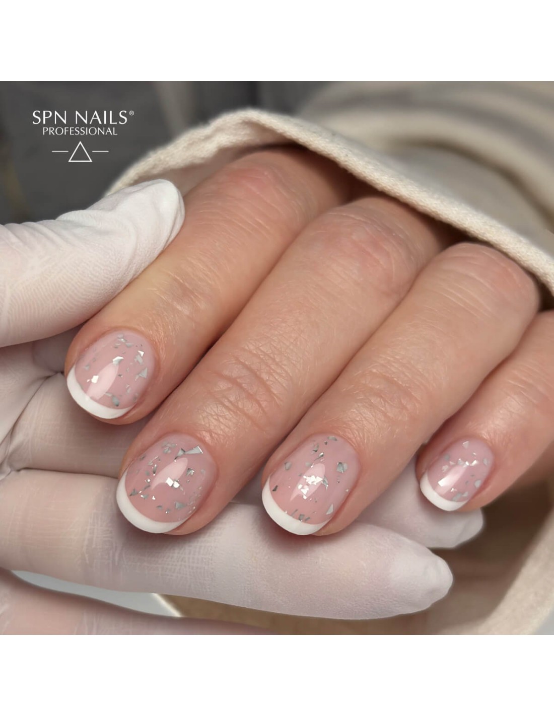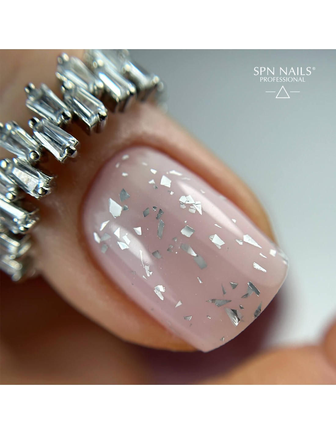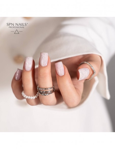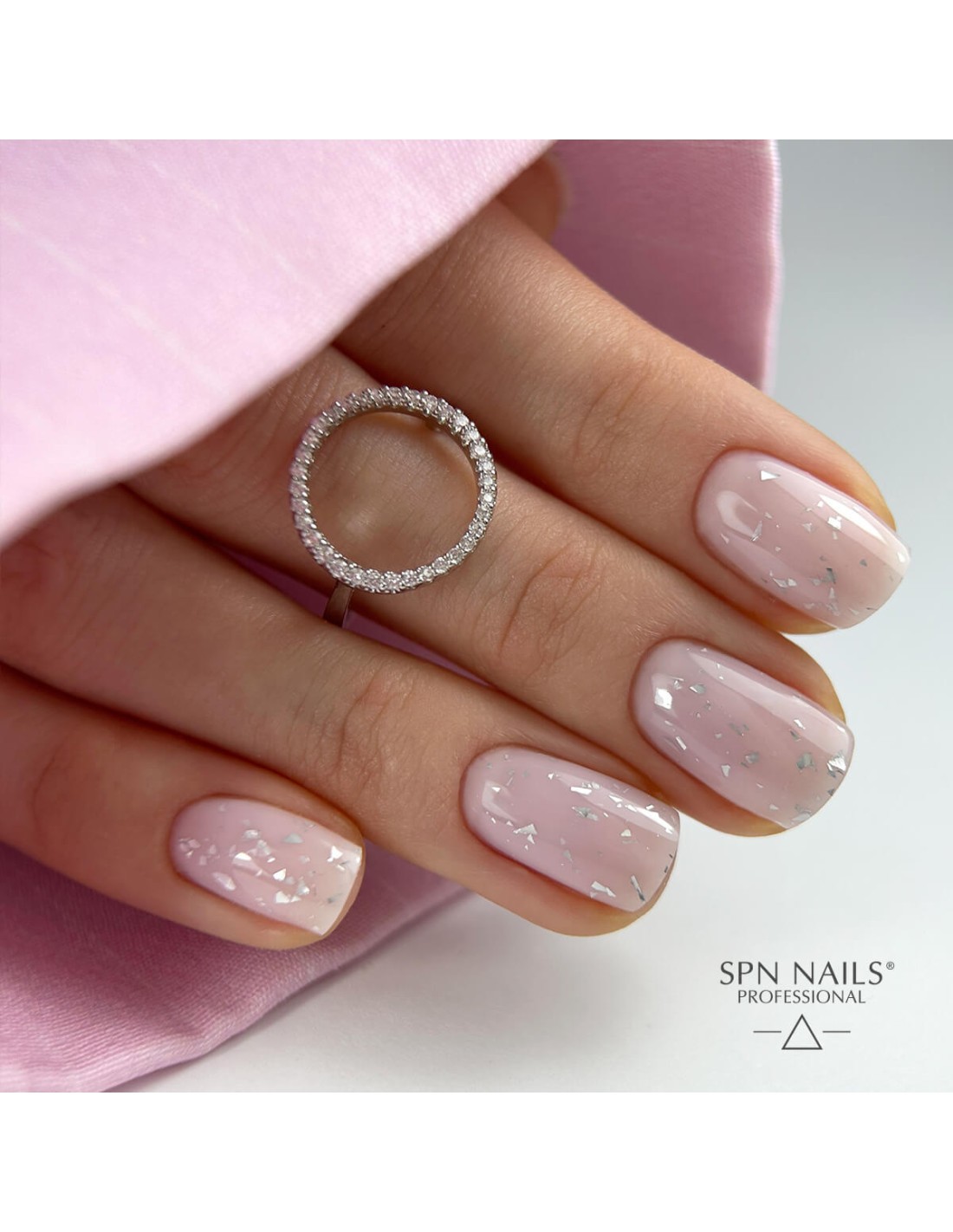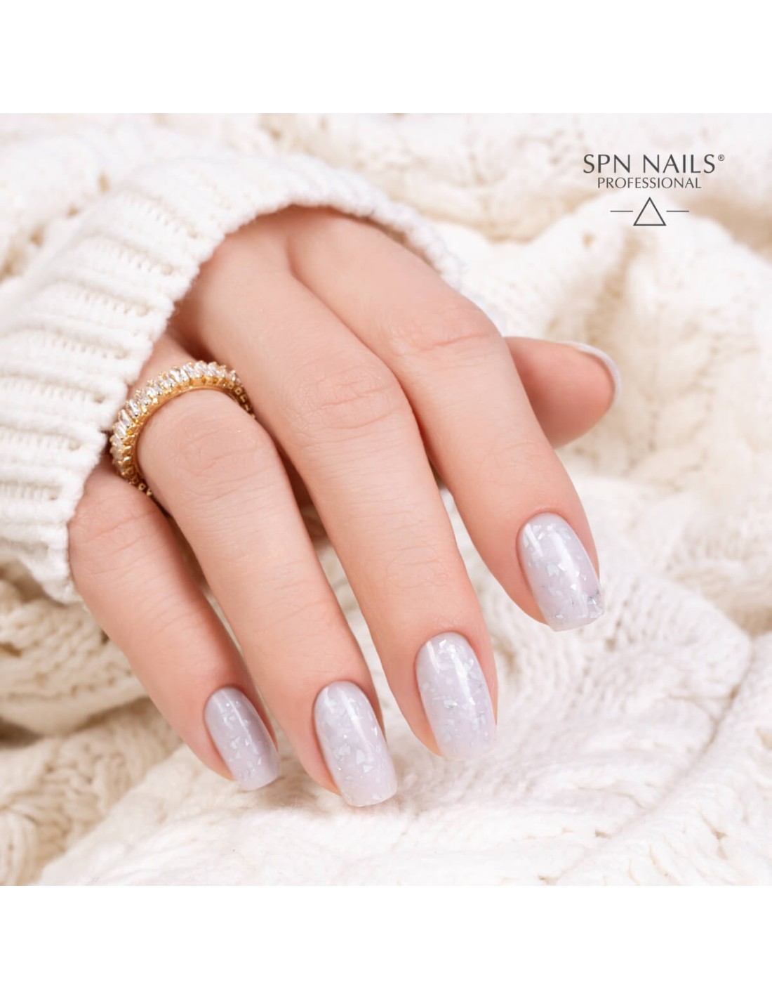 Den melkeaktige fargen beriket med sølvpartikler av kuttet folie skaper et delikat, men likevel slående utseende med et hint av glans. Denne neglelakken er perfekt for både minimalistiske stylinger og som et supplement til bryllups-, kvelds- eller babyboomer-manikyr. Den kan skilte med god pigmentering, enkel påføring og holdbarhet uten avskalling. Ideell for negledesign som ønsker å se lette, friske og elegante ut.