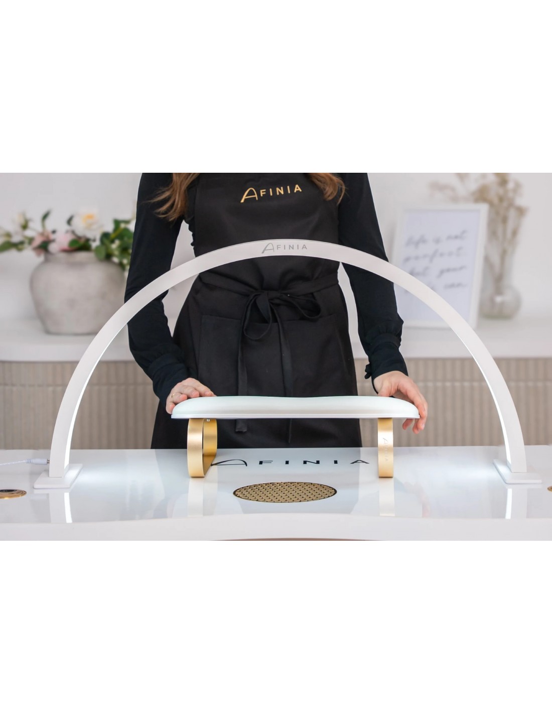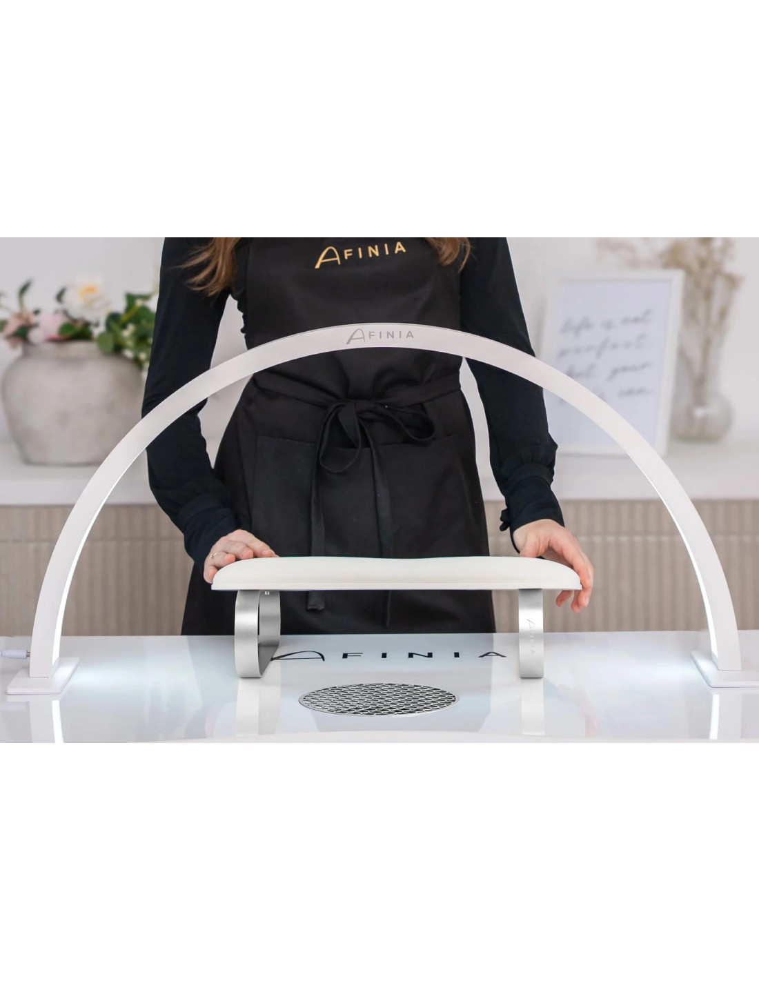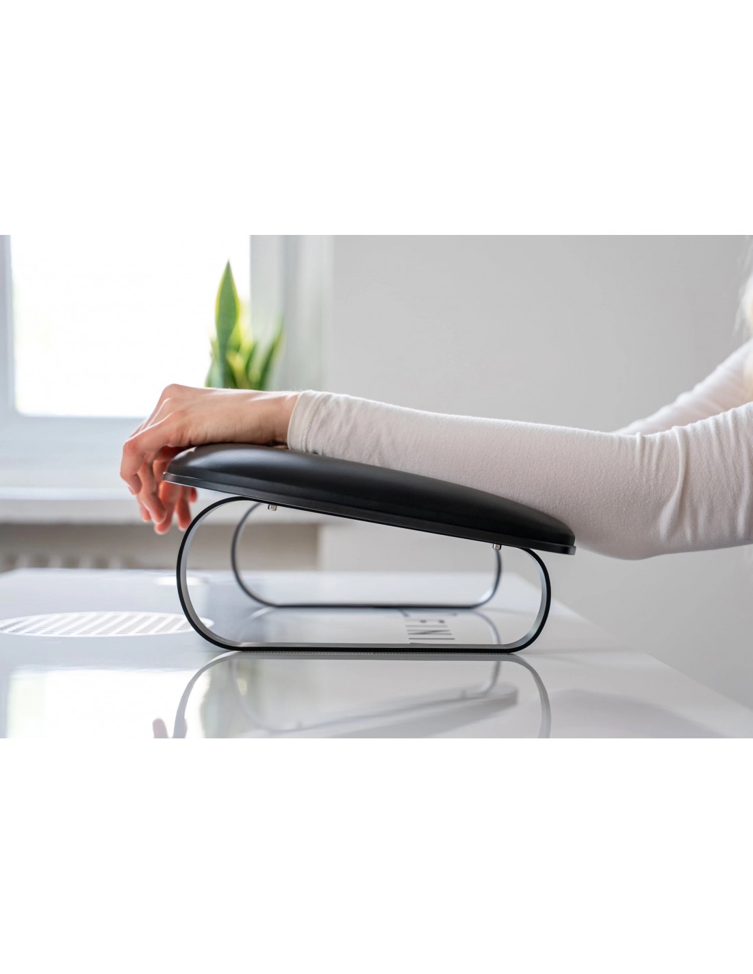 Et stilig og funksjonelt stativ, designet med både stylist og klient i tankene. Det ergonomiske designet gir komfortabel håndstøtte, noe som gjør neglestyling enklere. Laget av slitesterke materialer, er det motstandsdyktig mot aceton, varme og smuss, noe som sikrer langvarig bruk og enkel rengjøring.