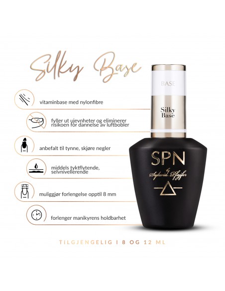 Silky Base er en revolusjon innen vitaminforsterkning av neglen! Beriket med nylonfibre som herder, E-vitamin som forsterker neglen og kalsium som motvirker brudd og lagoppdeling. Silky Base er en revolusjon innen vitaminforsterkning av neglen! Super-holdbar base med nylonfibre og vitaminer som forsterker svake negler. Den utfyller skader og ujevnheter, og gjør neglene motstandsdyktige mot sprekking og mekaniske skader.